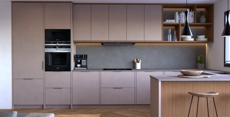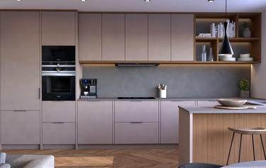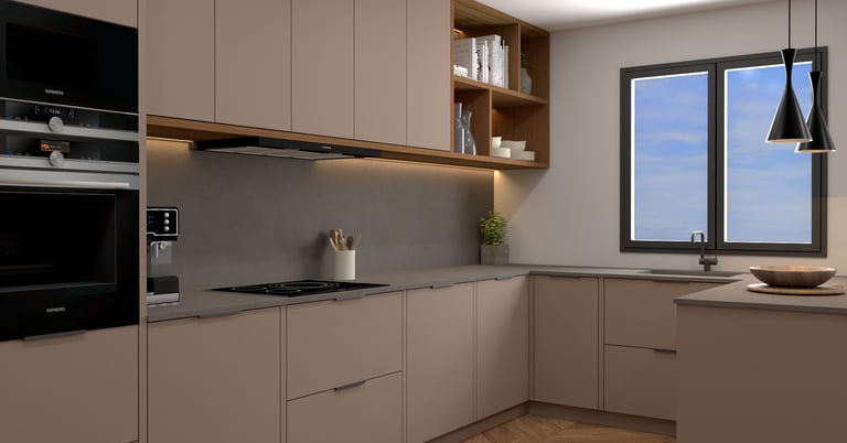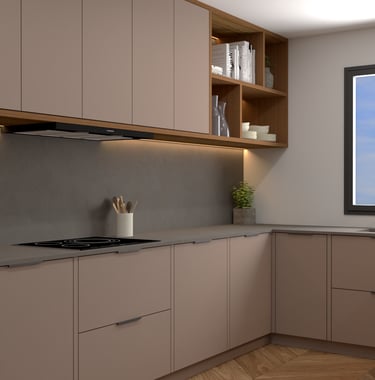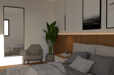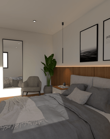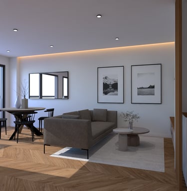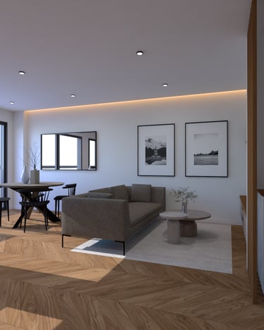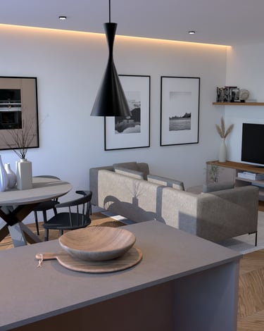Esta vivienda moderna y minimalista se concibe como un espacio abierto, luminoso y funcional. La cocina integrada actúa como eje central, conectándose con naturalidad con el salón y el comedor. Los tonos neutros y materiales nobles aportan serenidad, mientras que el mobiliario de líneas puras y los textiles cálidos mantienen el equilibrio entre estética y confort.