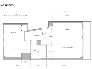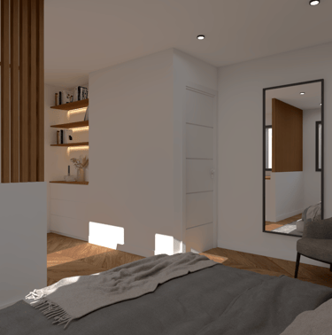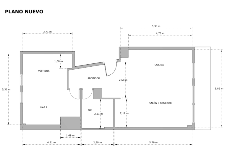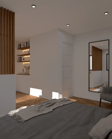 La intervención parte de una reestructuración total: se eliminan tabiques, se optimiza la circulación y se reorganizan los dormitorios para mejorar el almacenamiento y las proporciones. El nuevo vestidor y la mayor entrada de luz son resultado directo de esta redistribución más práctica y contemporánea.